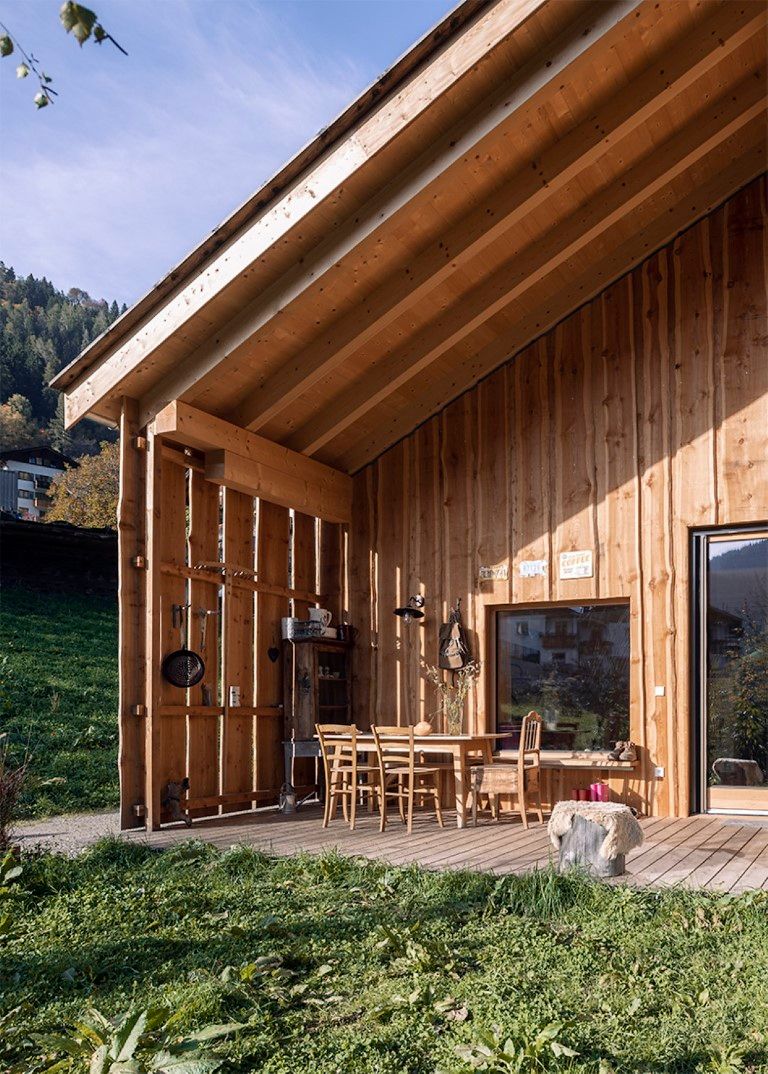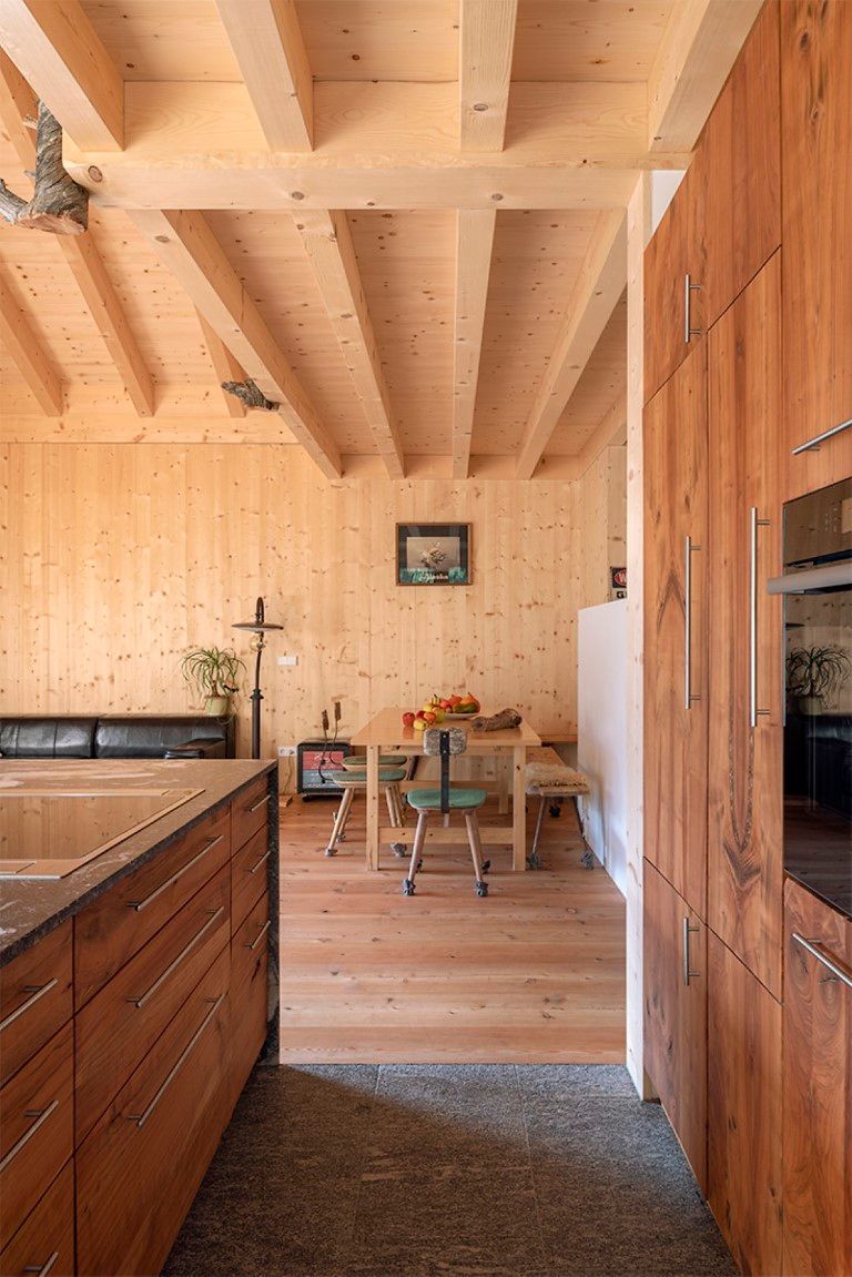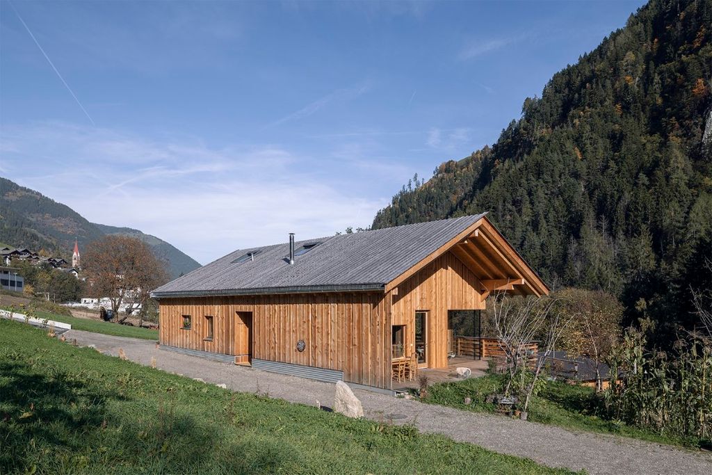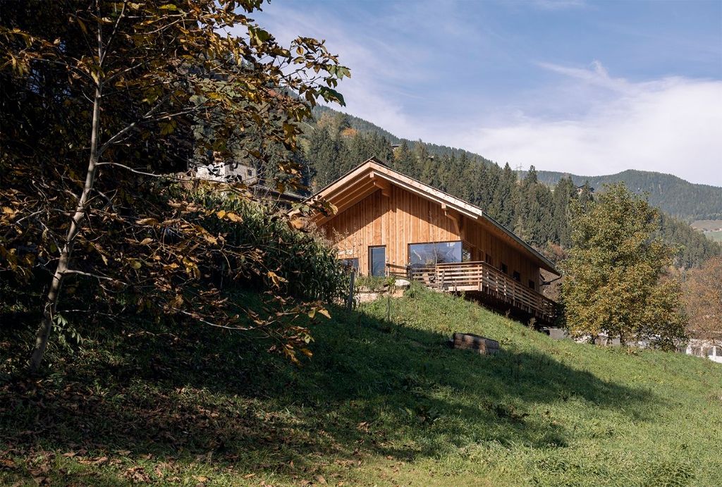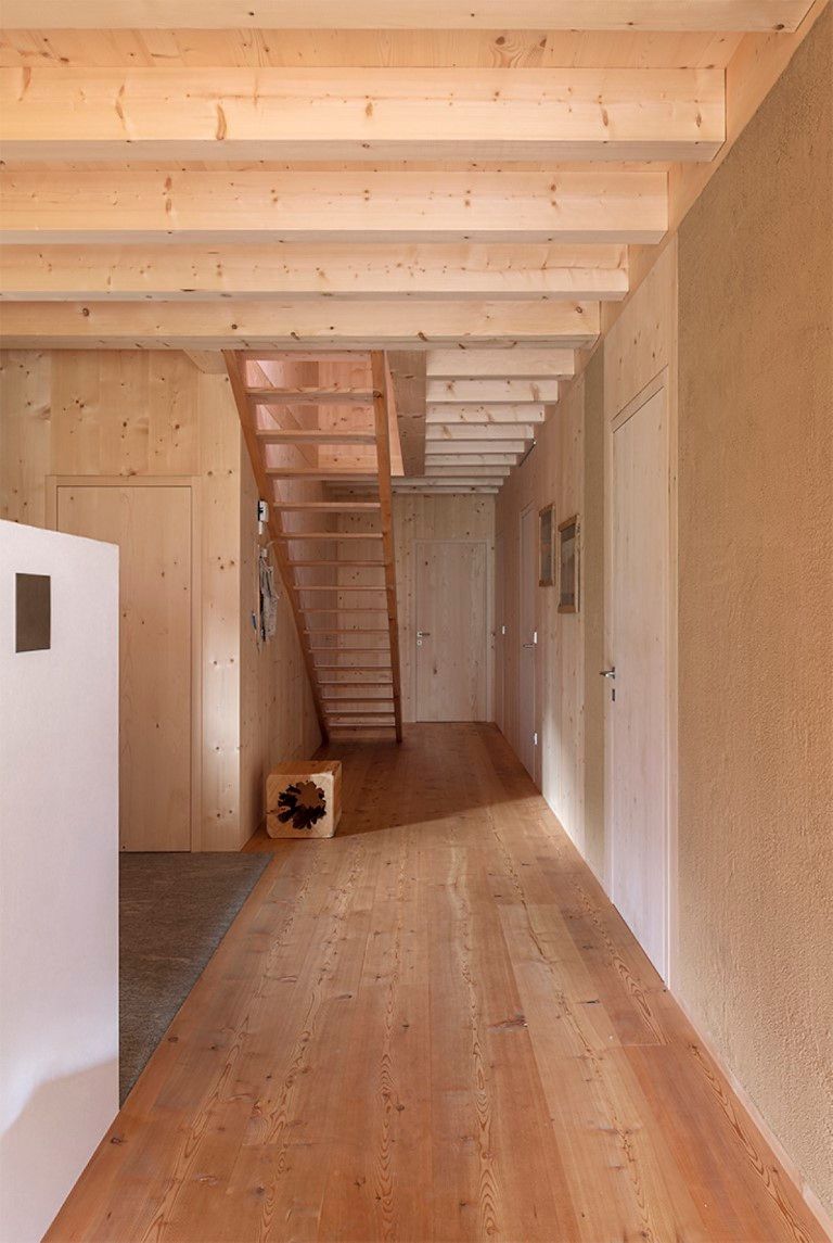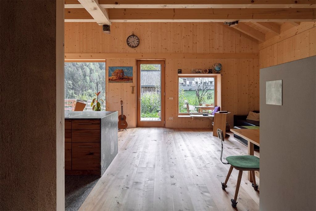 Das Wohnhaus E.befindet sich am Rande einer Wohnbausiedlung in St. Pankraz. Wie beim benachbarten Baumhaus ist auch dieses Gebäude ein Massivholzhaus. Das gesamte Gebäude wurde aus heimischem Massivholz errichtet, ohne jegliche Verwendung von verleimten Elementen. Ökologische und natürliche Materialien wurden auch im Innenraum verwendet: die in Sicht belassene Holzkonstruktion, Massivholzmöbel und Lehmputz bestimmen das Bild.