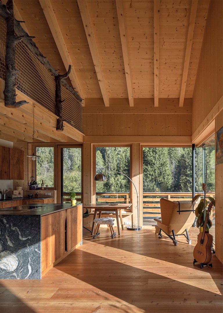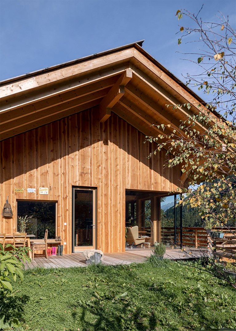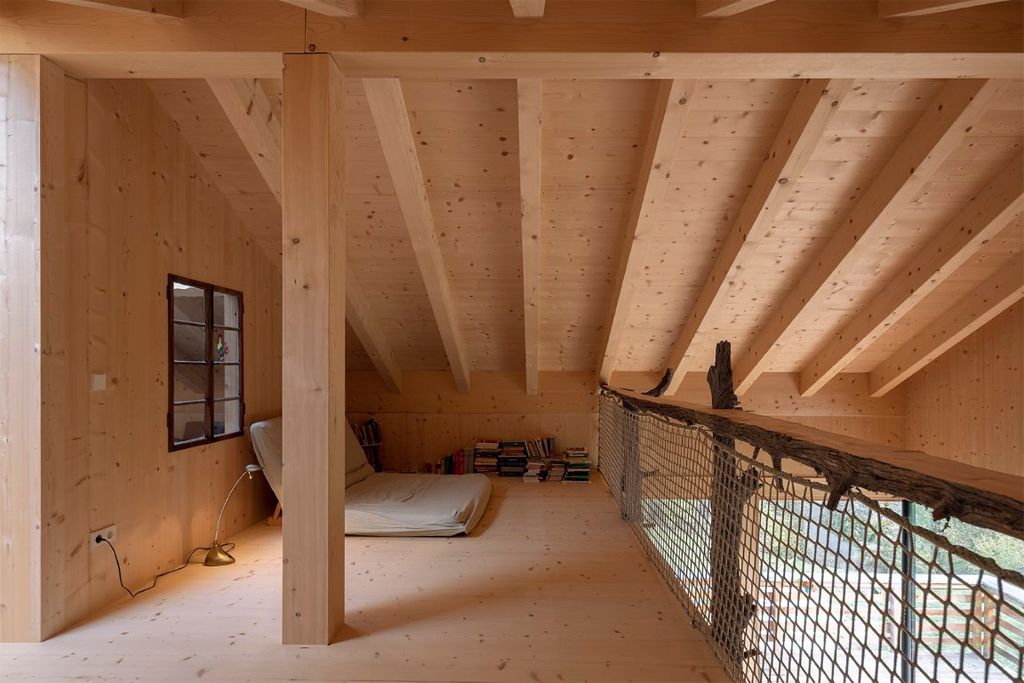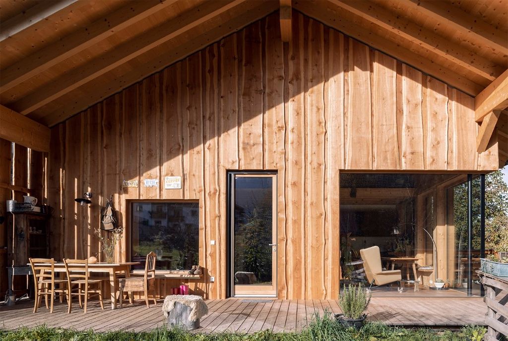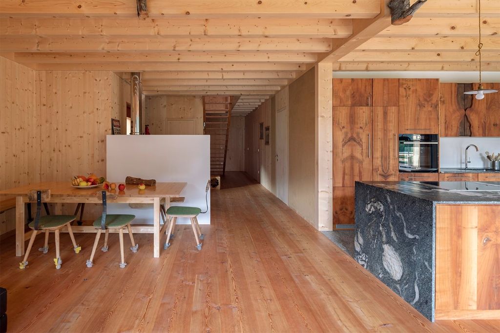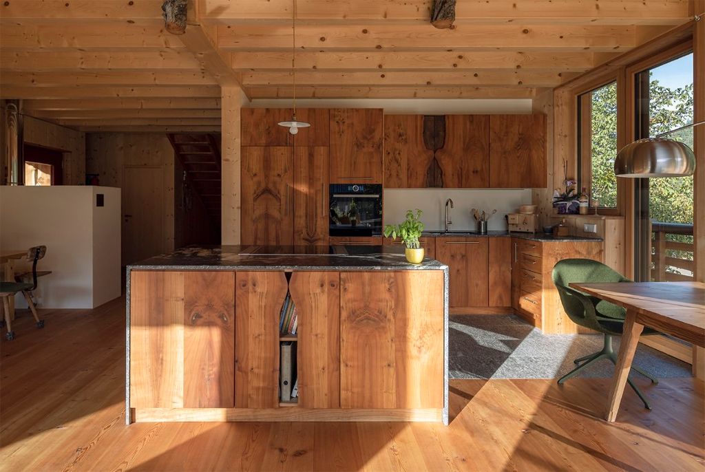 Das Wohnhaus E.befindet sich am Rande einer Wohnbausiedlung in St. Pankraz. Wie beim benachbarten Baumhaus ist auch dieses Gebäude ein Massivholzhaus. Das gesamte Gebäude wurde aus heimischem Massivholz errichtet, ohne jegliche Verwendung von verleimten Elementen. Ökologische und natürliche Materialien wurden auch im Innenraum verwendet: die in Sicht belassene Holzkonstruktion, Massivholzmöbel und Lehmputz bestimmen das Bild.