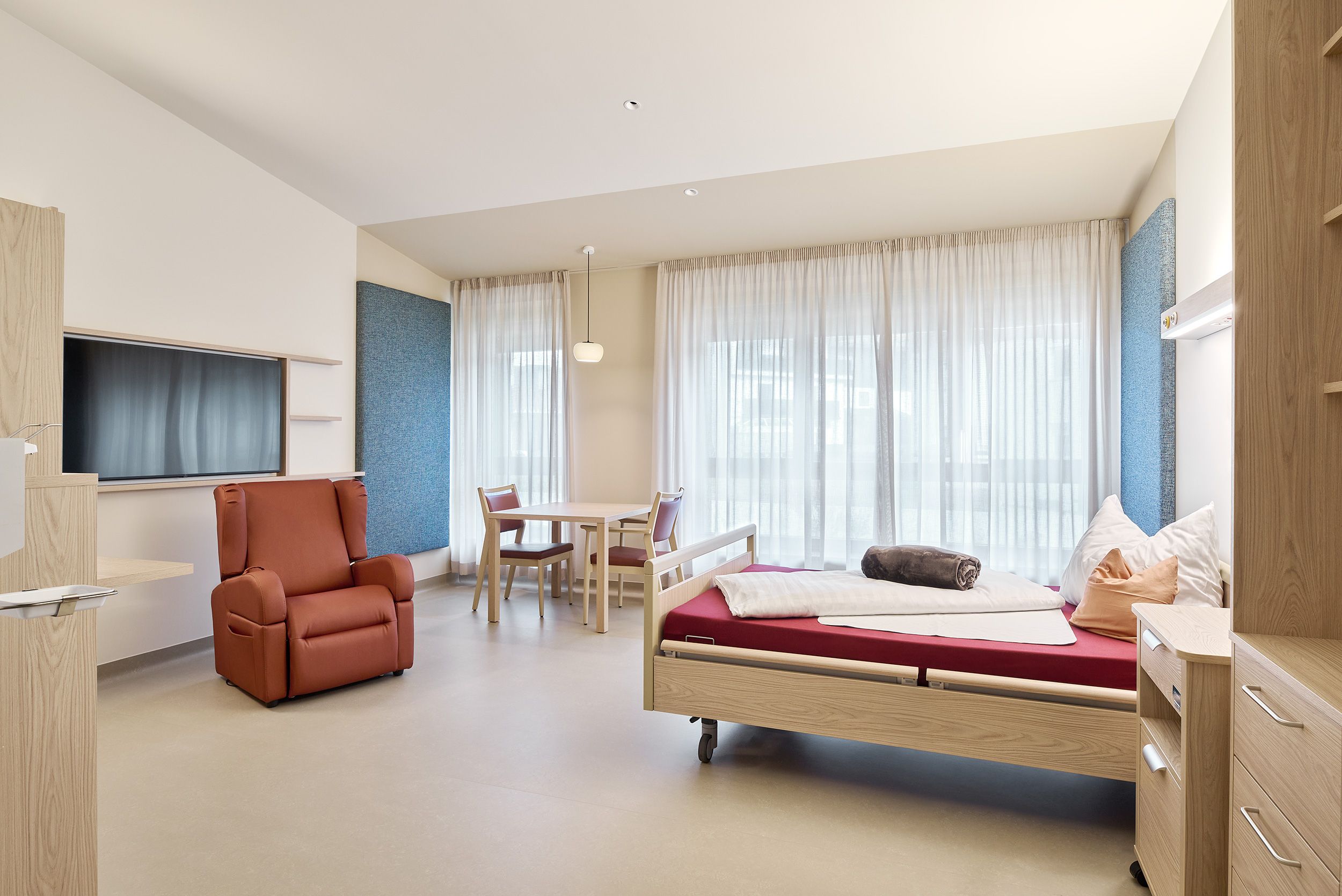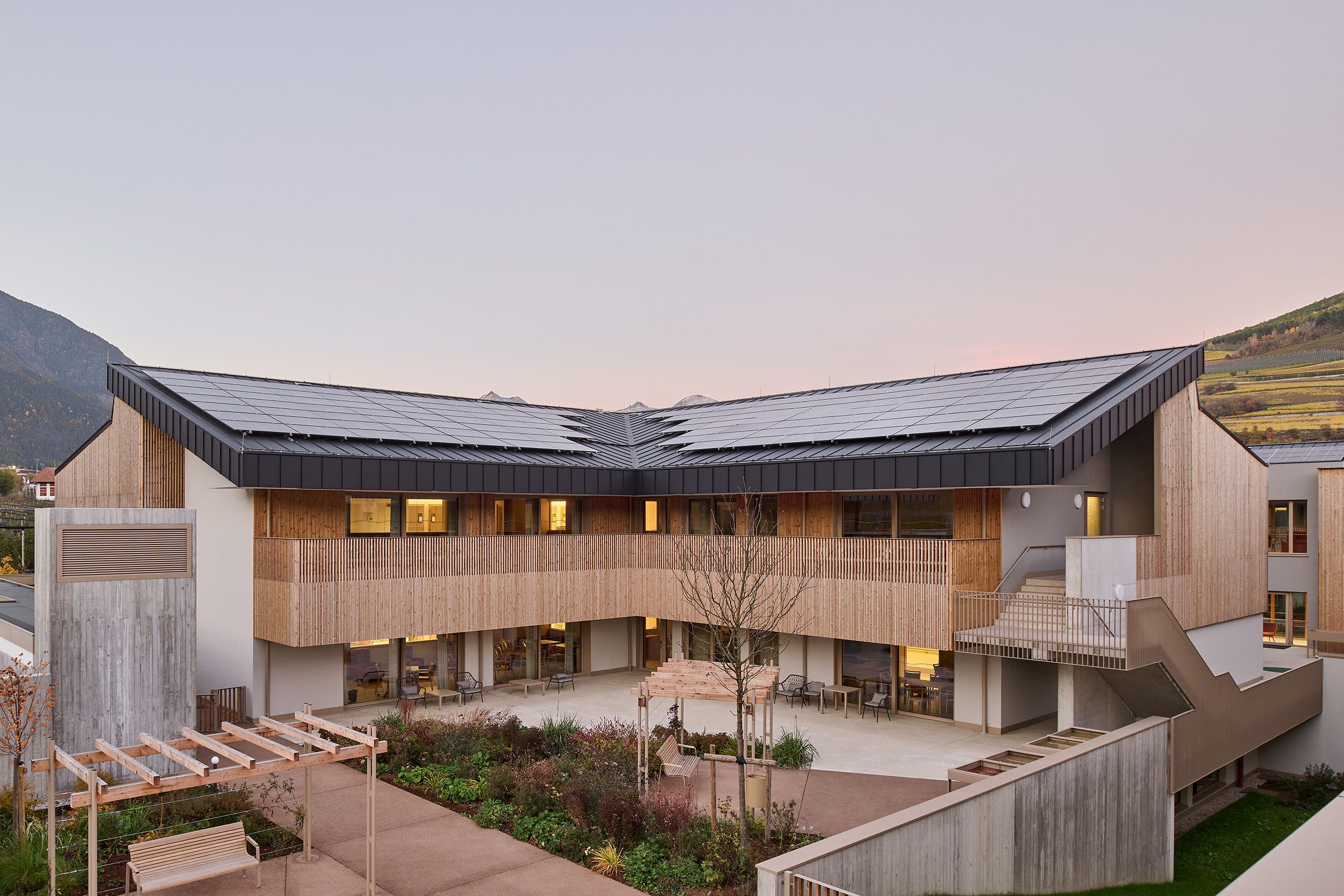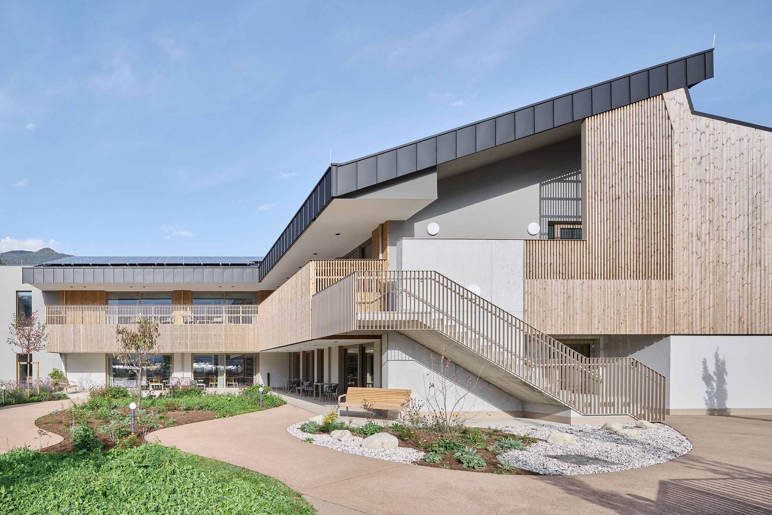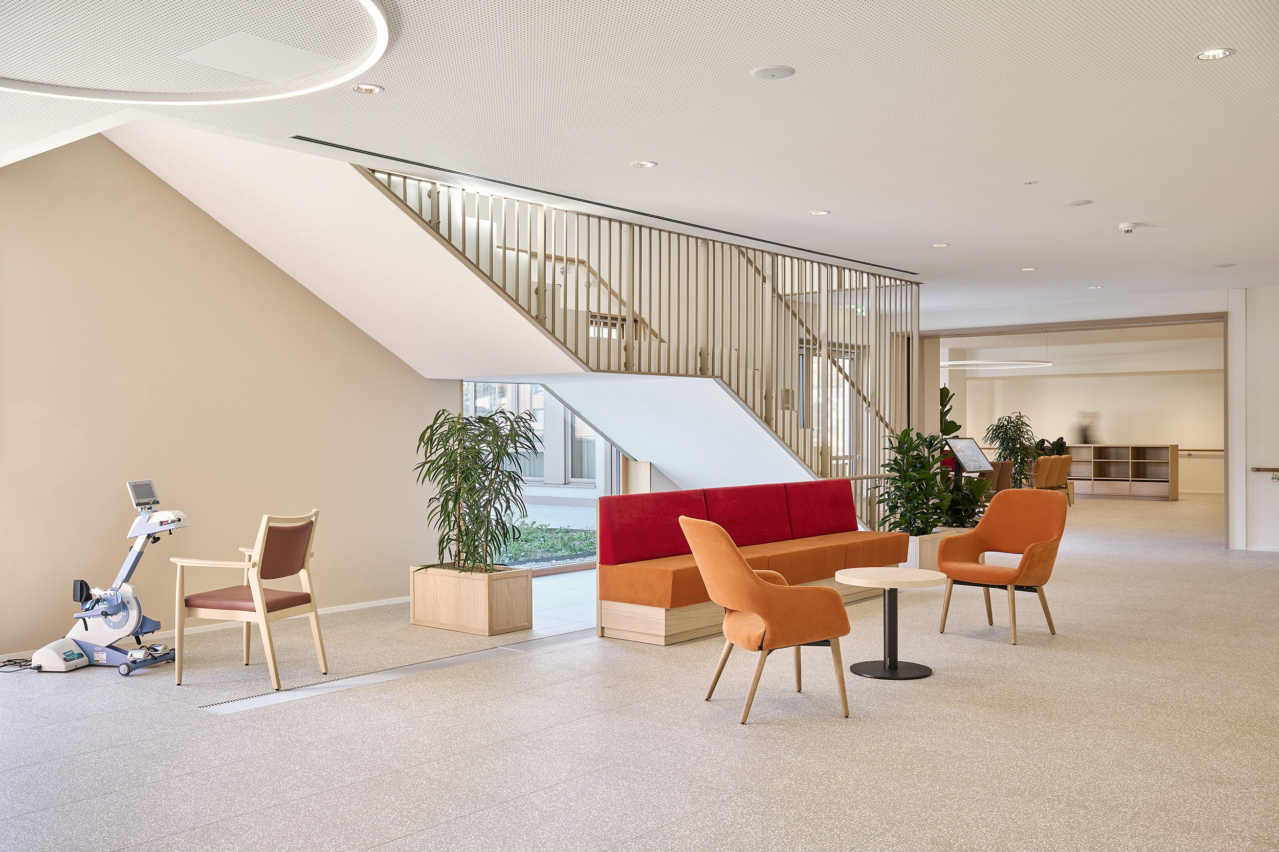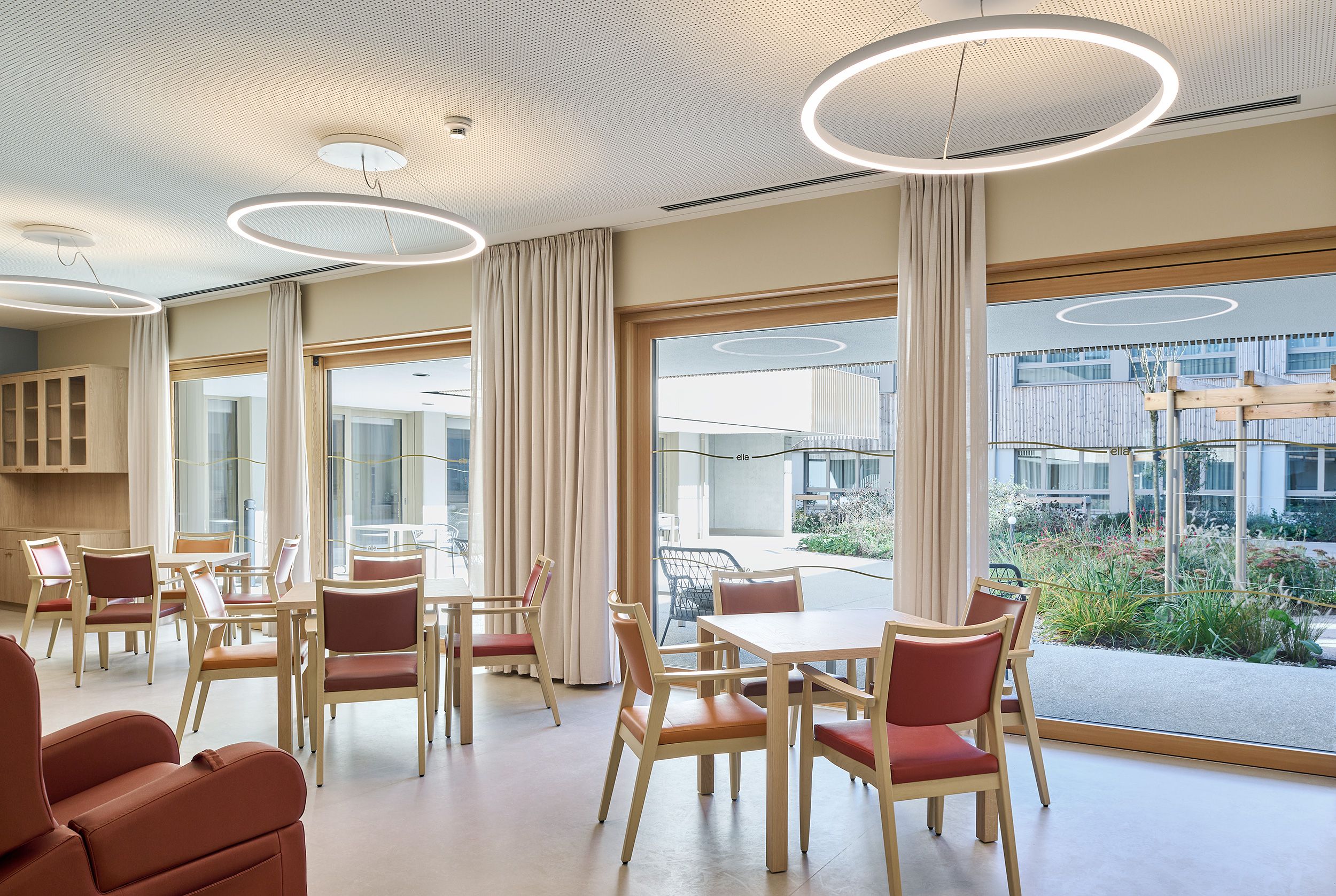 Öffentliche Bereiche wie Café, Mensa, Ambulatorien und Eingangsplatz laden dazu ein, die Einrichtung mit der Außenwelt zu verknüpfen. Sie ermöglichen den Bewohnerinnen und Bewohnern eine aktive Teilhabe am sozialen Leben und verhindern die Isolation der Struktur. Hohe Wohnqualität, eine nachhaltige und energieeffiziente Bauweise sowie fortschrittliche technische Lösungen wie Geothermie und Photovoltaik verbinden sich zu einem zukunftsweisenden Gebäudekonzept.