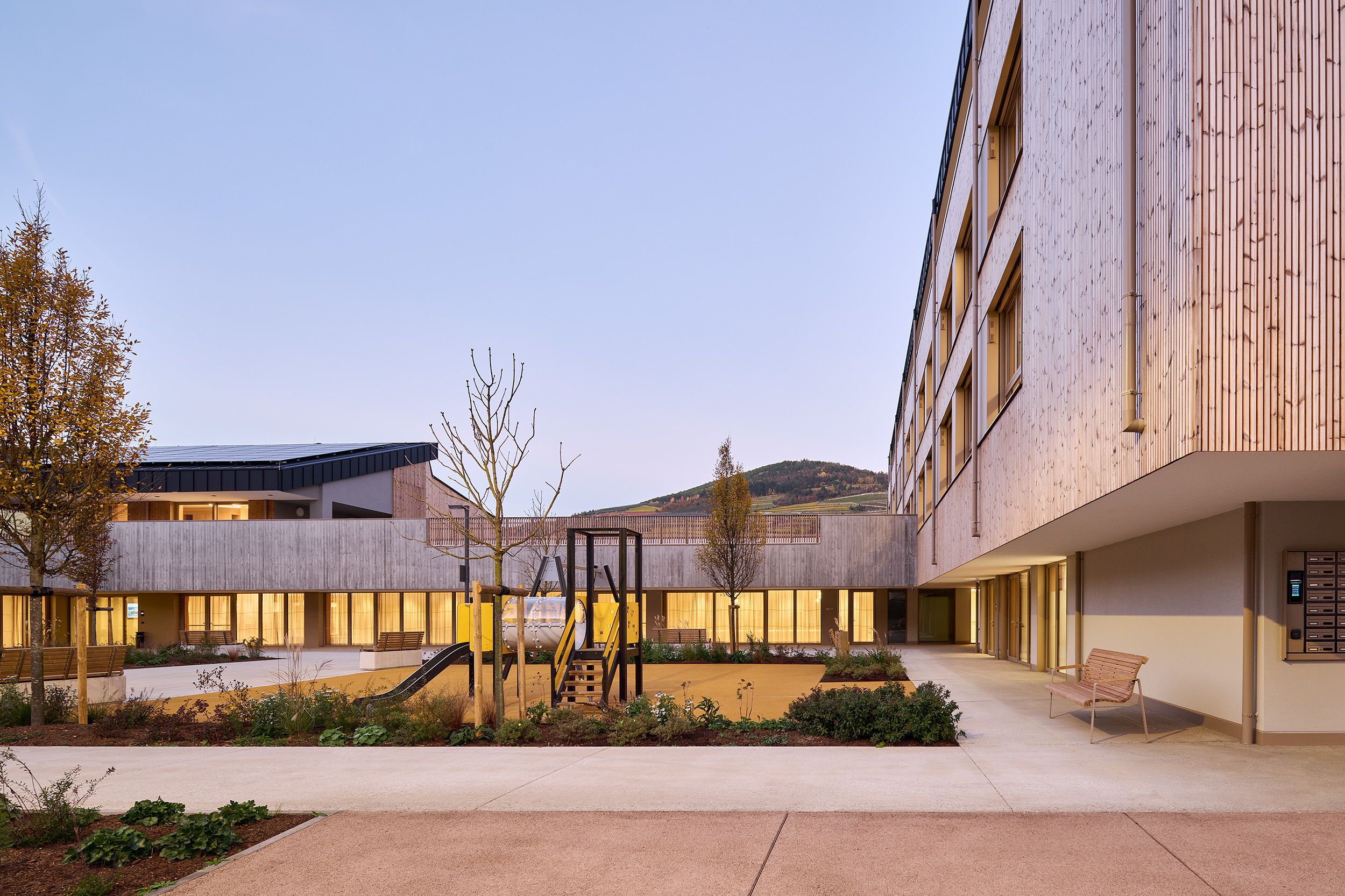 Das neue Seniorenwohnheim folgt den Leitprinzipien des Kuratoriums Deutsche Altershilfe: Privatleben – Gemeinschaftsleben – öffentliches Leben. Im Spannungsfeld zwischen Obstwiesen und städtischer Bebauung fügt sich die Anlage mit vier Baukörpern, die jeweils einen Innenhof umschließen, harmonisch in die kleinstrukturierte Umgebung ein. Durch die Schaffung von Mikrozonen, in denen Seniorinnen und Senioren wie in einer großen Familiengemeinschaft zusammenleben, tritt die Dimension der Einrichtung mit 120 Betten bewusst in den Hintergrund.