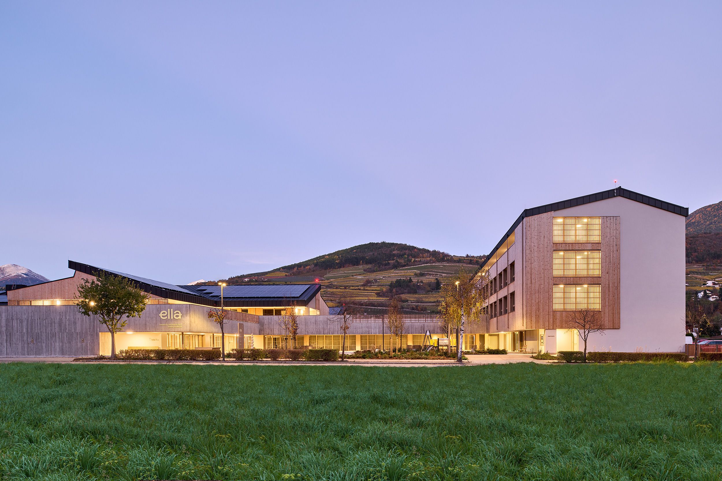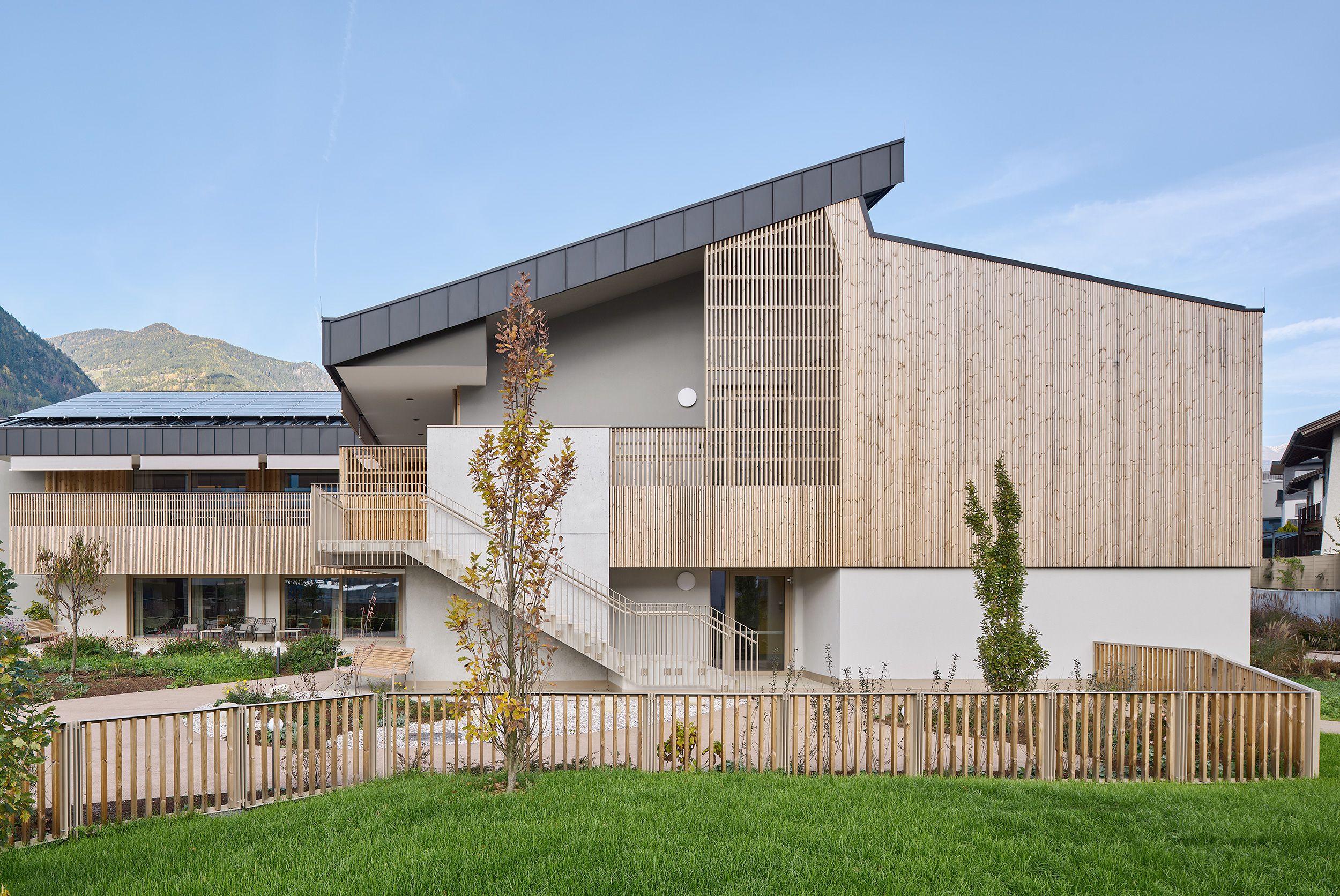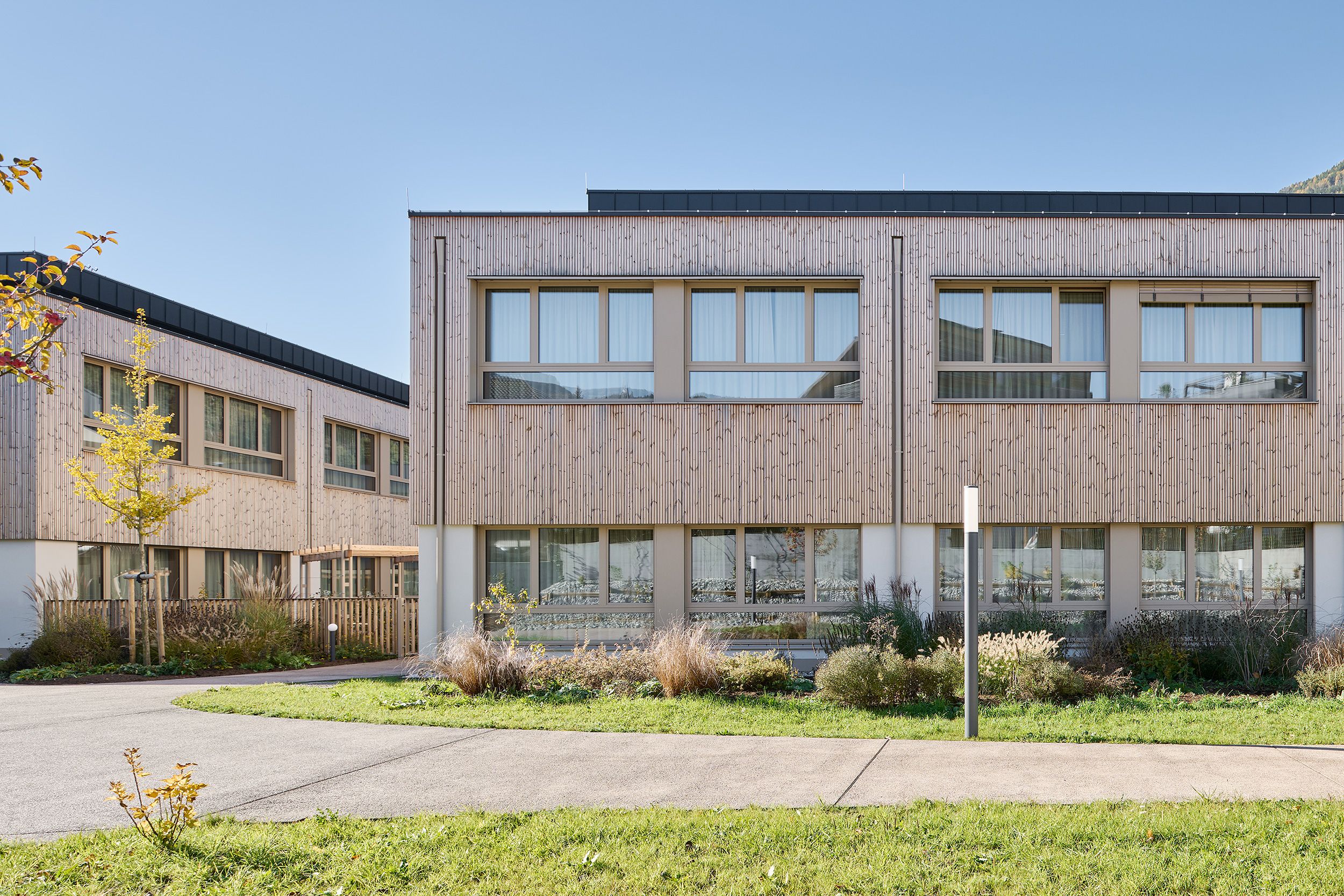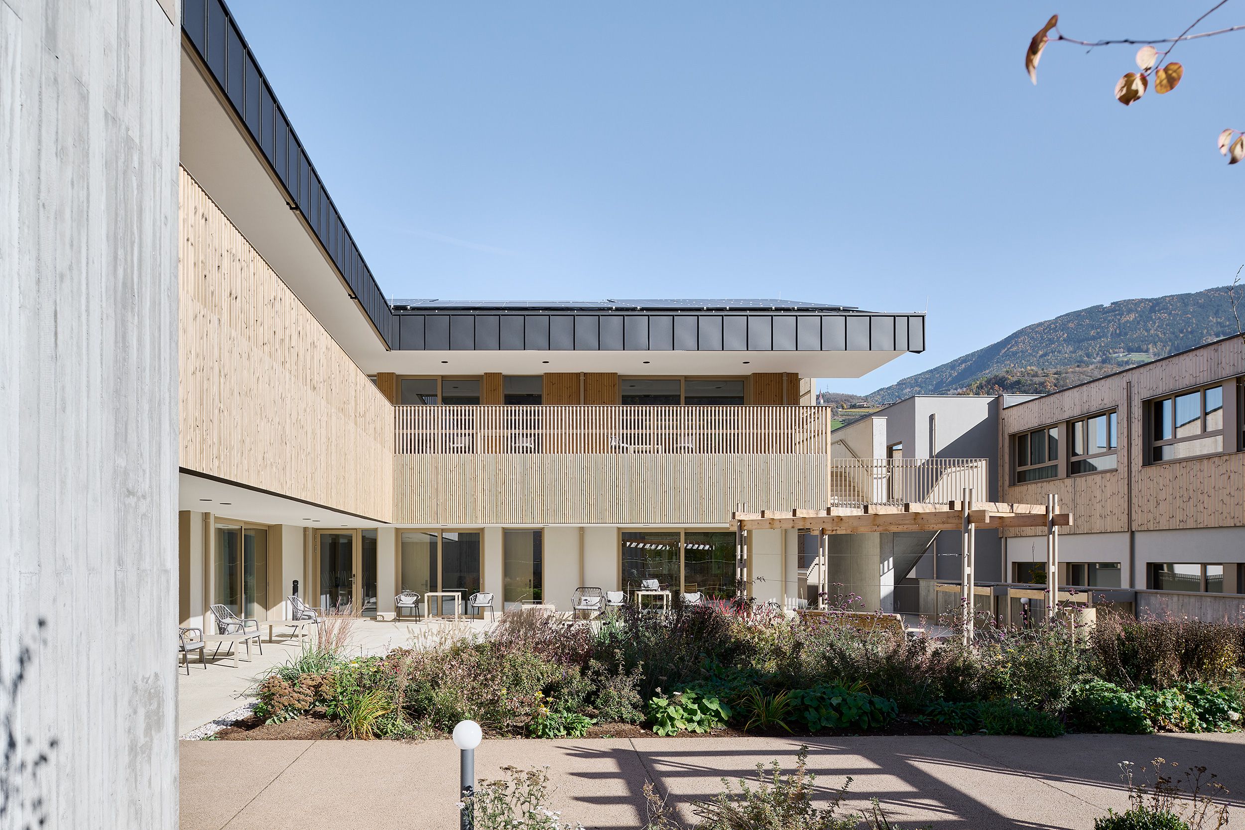 The new senior living residence follows the guiding principles of the Kuratorium Deutsche Altershilfe: private life – community life – public life. Set within the transitional landscape between orchards and urban development, the complex integrates harmoniously into its small-scale surroundings through four building volumes, each enclosing an internal courtyard. By creating micro-zones in which senior citizens live together as if in a large family community, the scale of the 120-bed facility is deliberately downplayed.