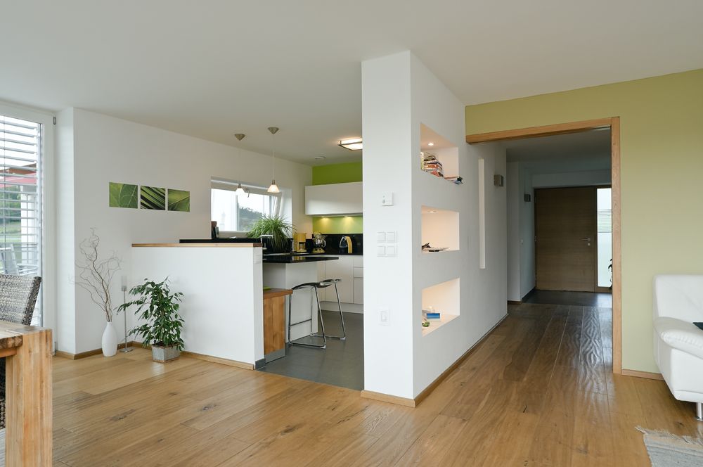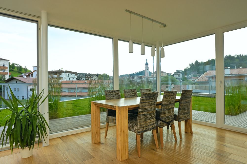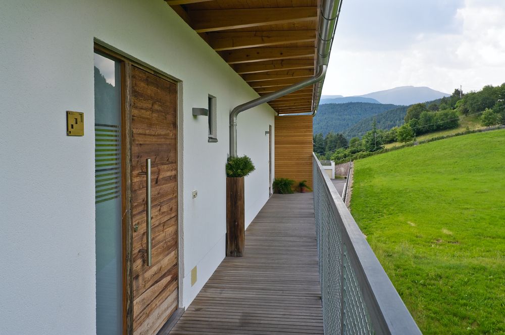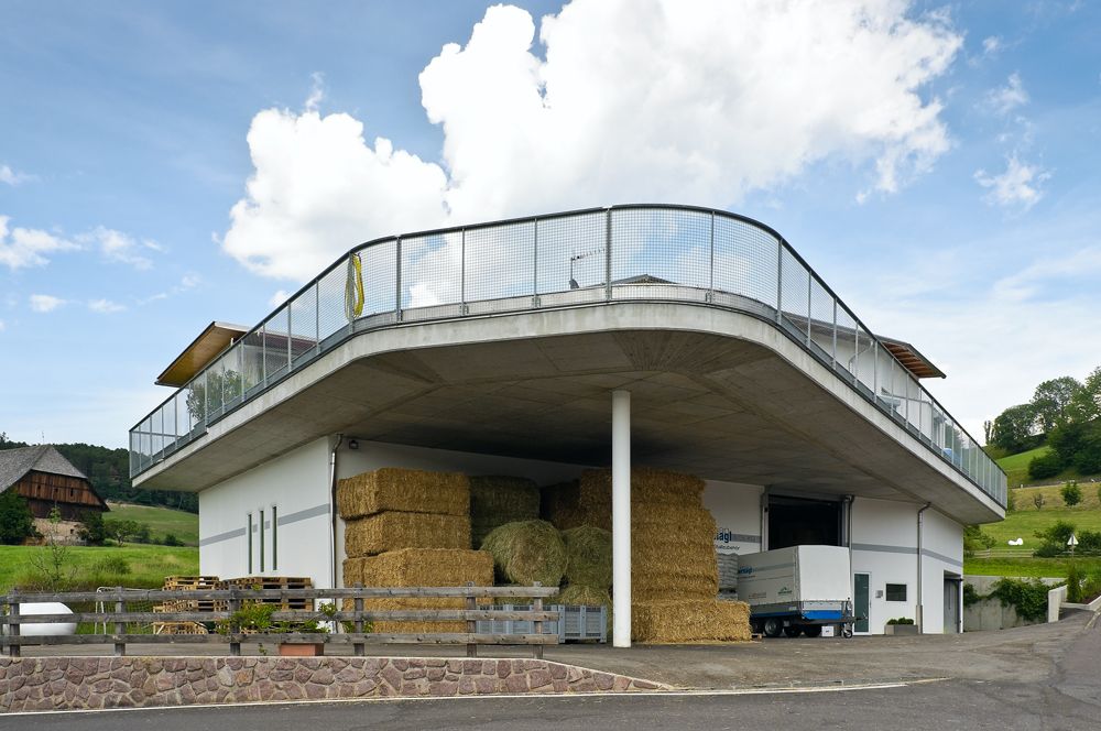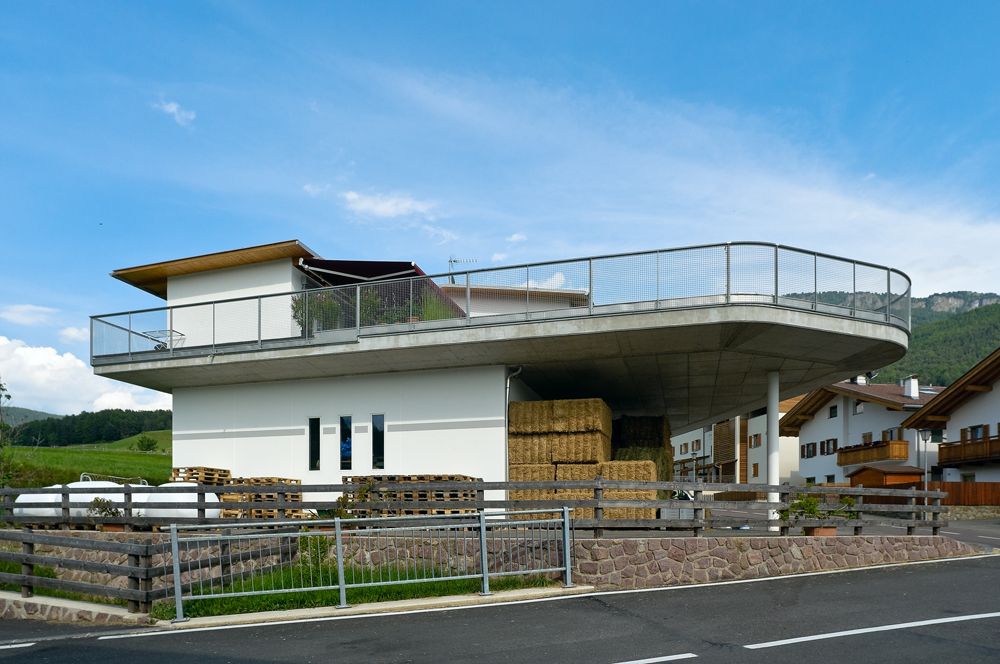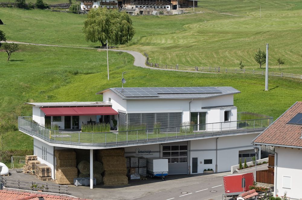 Tra l’area commerciale e quella residenziale si sono adottate diverse soluzioni costruttive: Mentre il piano terra è stato realizzato mediante l’impiego di elementi prefabbricati in cemento armato, il piano superiore è stato interamente costruito in legno, creando un’atmosfera calda e accogliente. L’unità residenziale è stata progettata seguendo i principi di una casa passiva e ha ottenuto la certificazione “Gold plus” come casa climatica, garantendo alti standard di efficienza energetica.