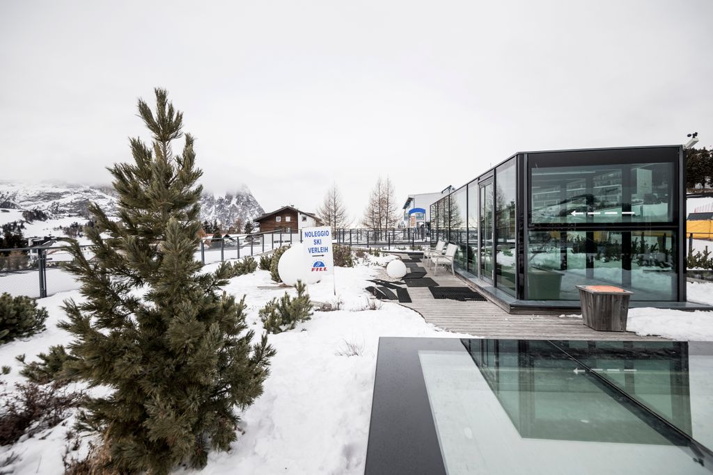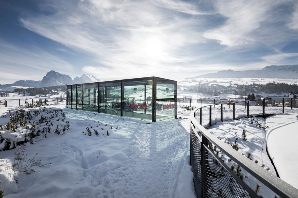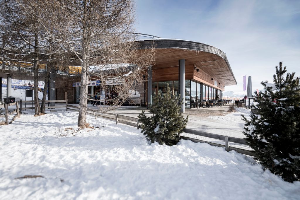 Il Centro di Sci di Fondo, situato a un’altitudine di 1800 metri sull’Alpe di Siusi, all’interno del Parco Naturale dello Sciliar, si distingue per la sua attenta integrazione nel suggestivo paesaggio alpino circostante. il terreno in leggera pendenza sul versante nord si sovrappone elegantemente agli edifici, rendendoli visibili solo dal lato sud. I diversi edifici sono connessi da ponti, alcuni dei quali di forma curva per sottolineare il concetto la fusione del design con l’ambiente circostante.