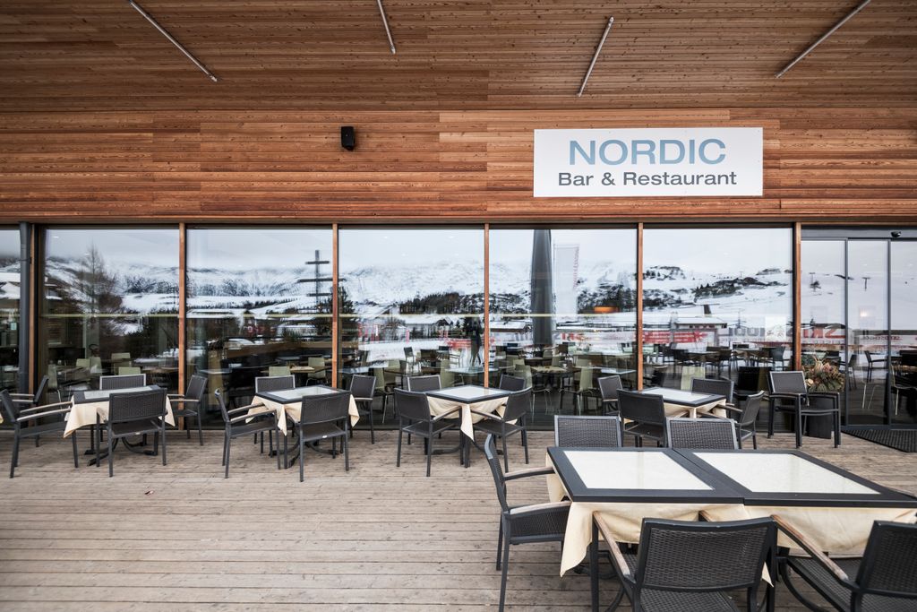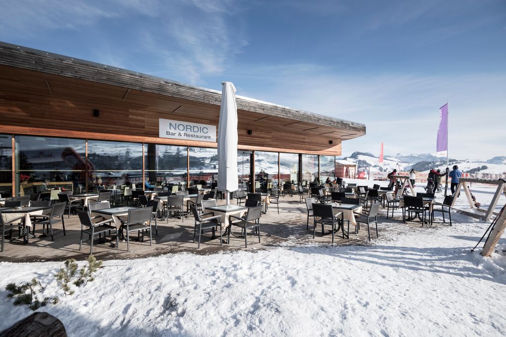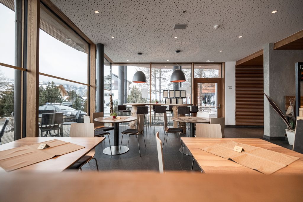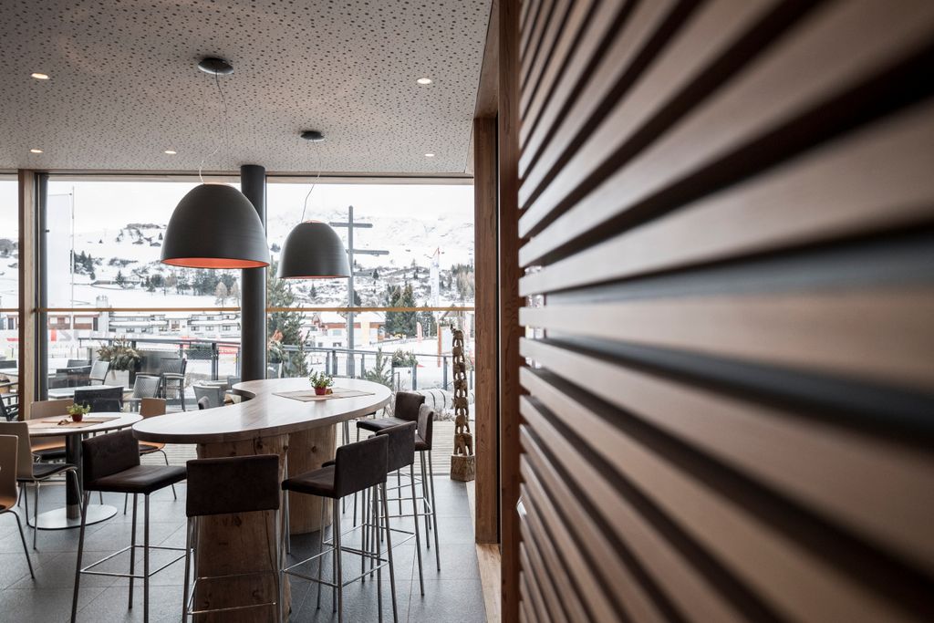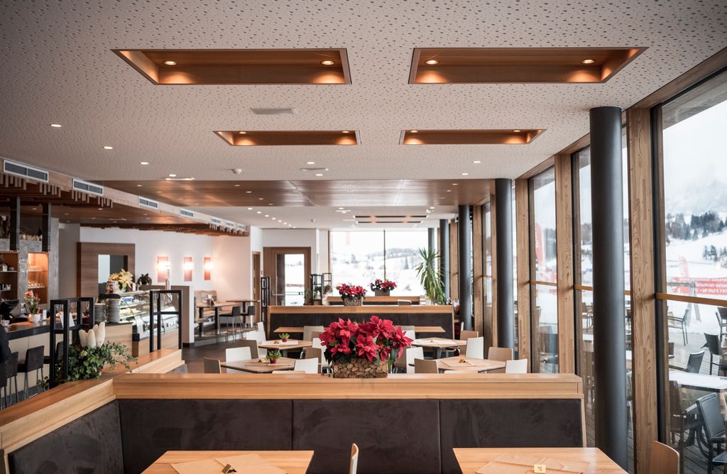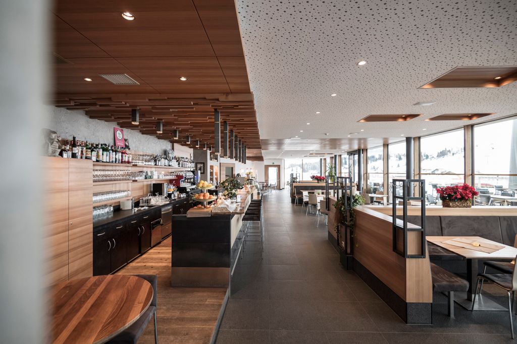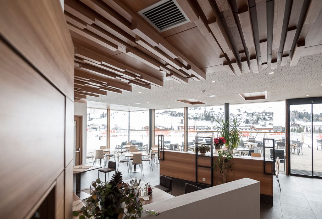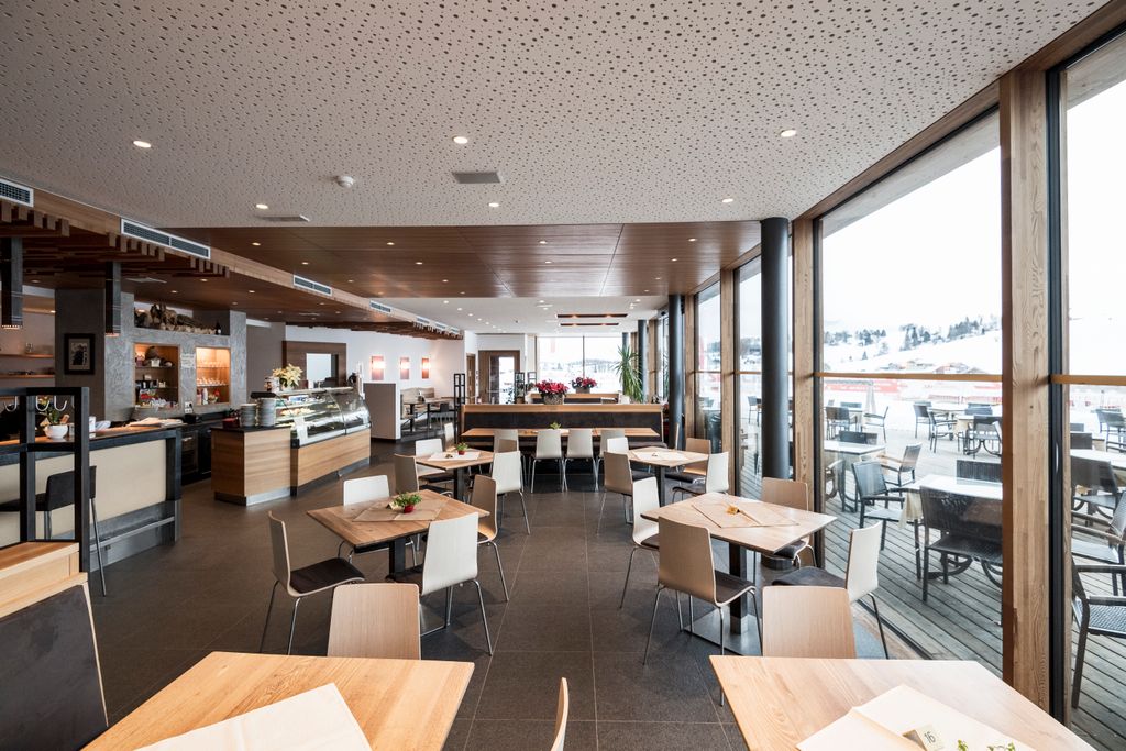 All’interno degli edifici, la bellezza del paesaggio è accuratamente integrata: le ampie vetrate del ristorante, offrono una vista panoramica mozzafiato. Il concept spaziale è improntato alla semplicità e alla funzionalità, con il bar/ristorante, il negozio, gli spogliatoi, gli armadietti e i servizi igienici disposti in modo efficace e organizzato. Nella scelta dei materiali, prevale l’uso di legno, vetro ed elementi verdi, creando un’armonia visiva con l’ambiente circostante.