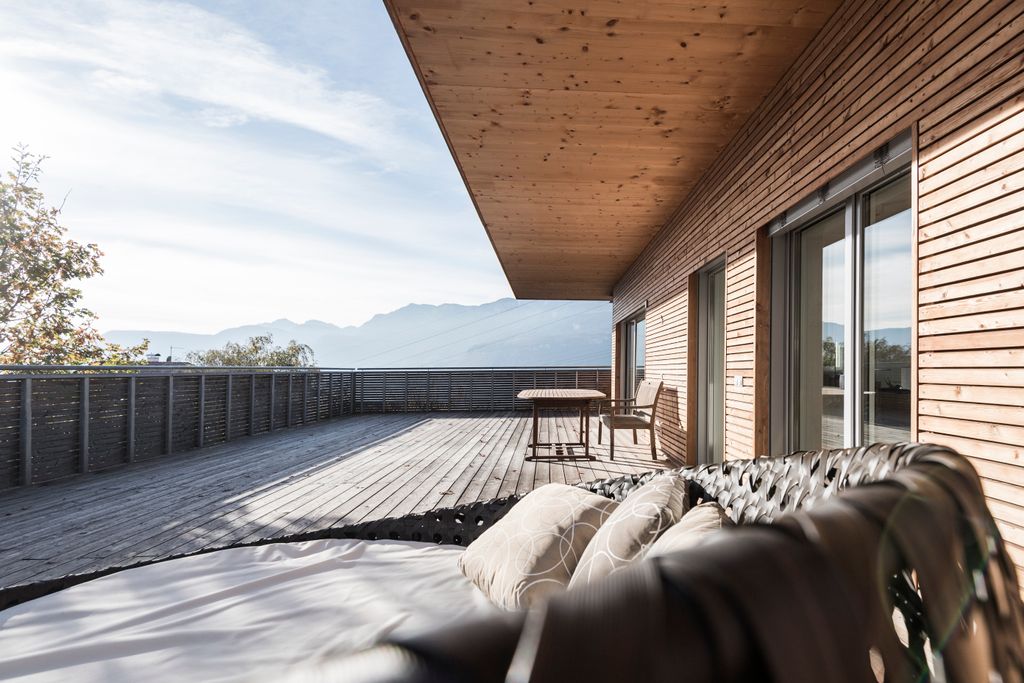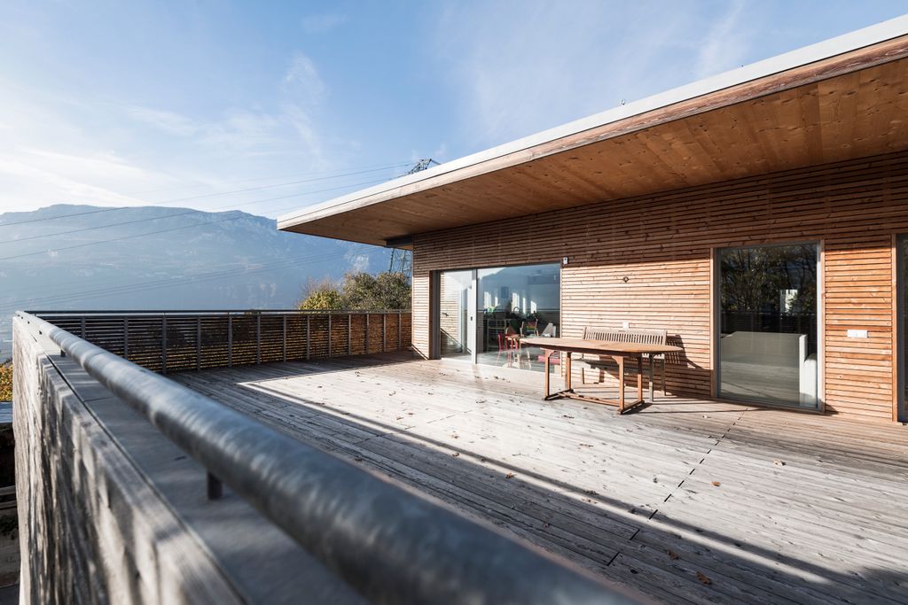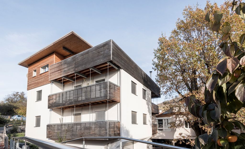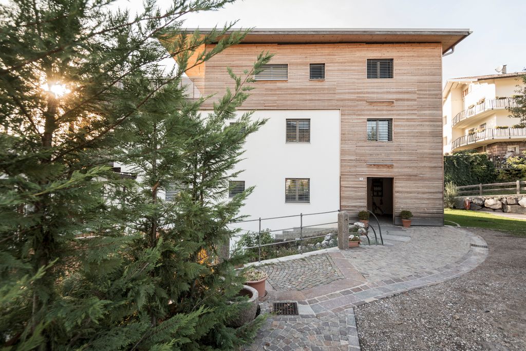L’uso mirato di intonaco e rivestimento in legno sulla facciata riflette sia le diverse metodologie costruttive (esistente/nuovo, massiccio/legno) che contribuisce a definire l’aspetto compatto e strutturato dell’edificio.