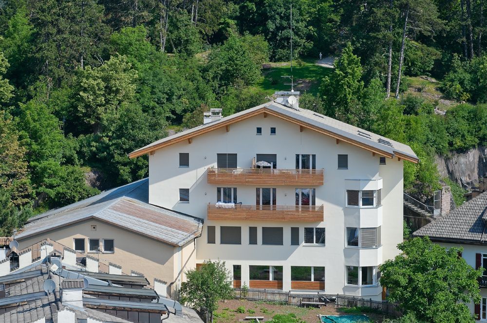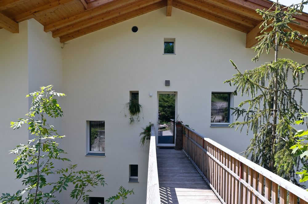 La canonica del 1965 è stata completamente ristrutturata con il focus sull’efficienza energetica. Il tetto e le pareti esterne hanno ricevuto un isolamento termico di 32 cm e 25 cm rispettivamente. Nuove finestre con triplo vetro e cassonetti isolati termicamente hanno ridotto le dispersioni di calore. I balconi in cemento sono stati sostituiti da balconi in legno, eliminando i ponti termici. Un sistema di ventilazione ha migliorato la qualità dell’aria. Il consumo energetico per il riscaldamento è stato ridotto dell’86%, portandolo a 29 kWh/m²a, ottenendo la certificazione casa clima A, la prima in Italia per una casa privata.