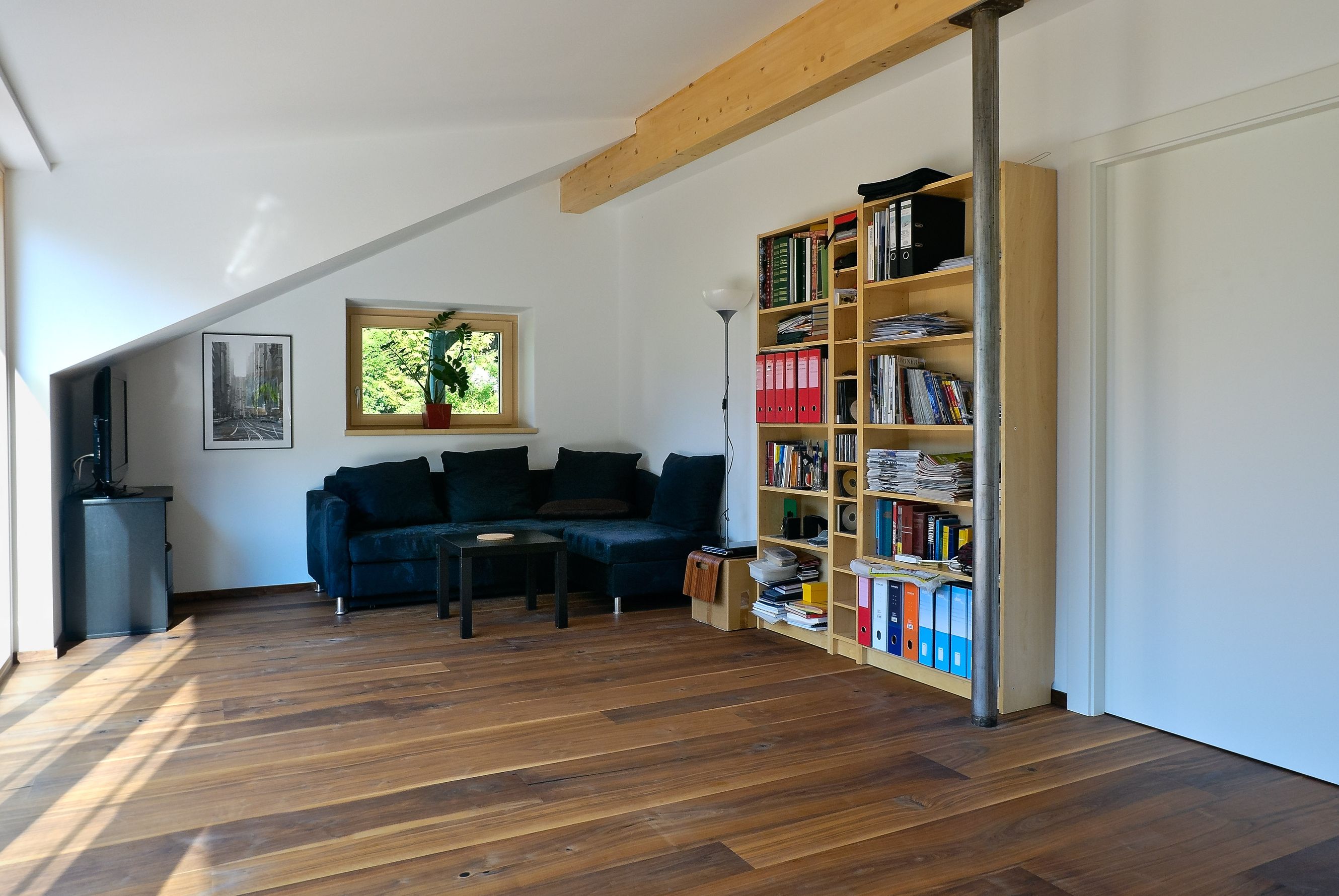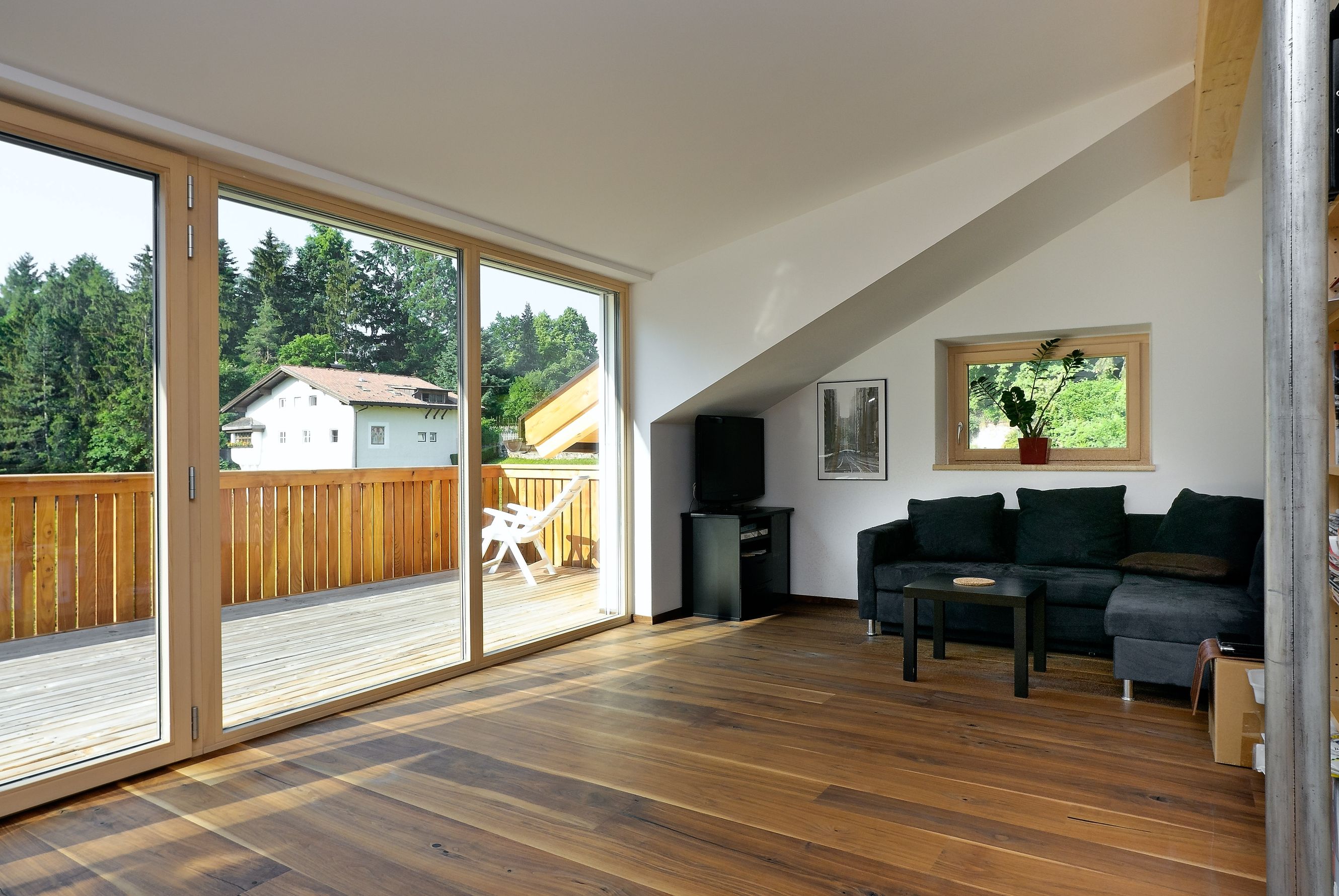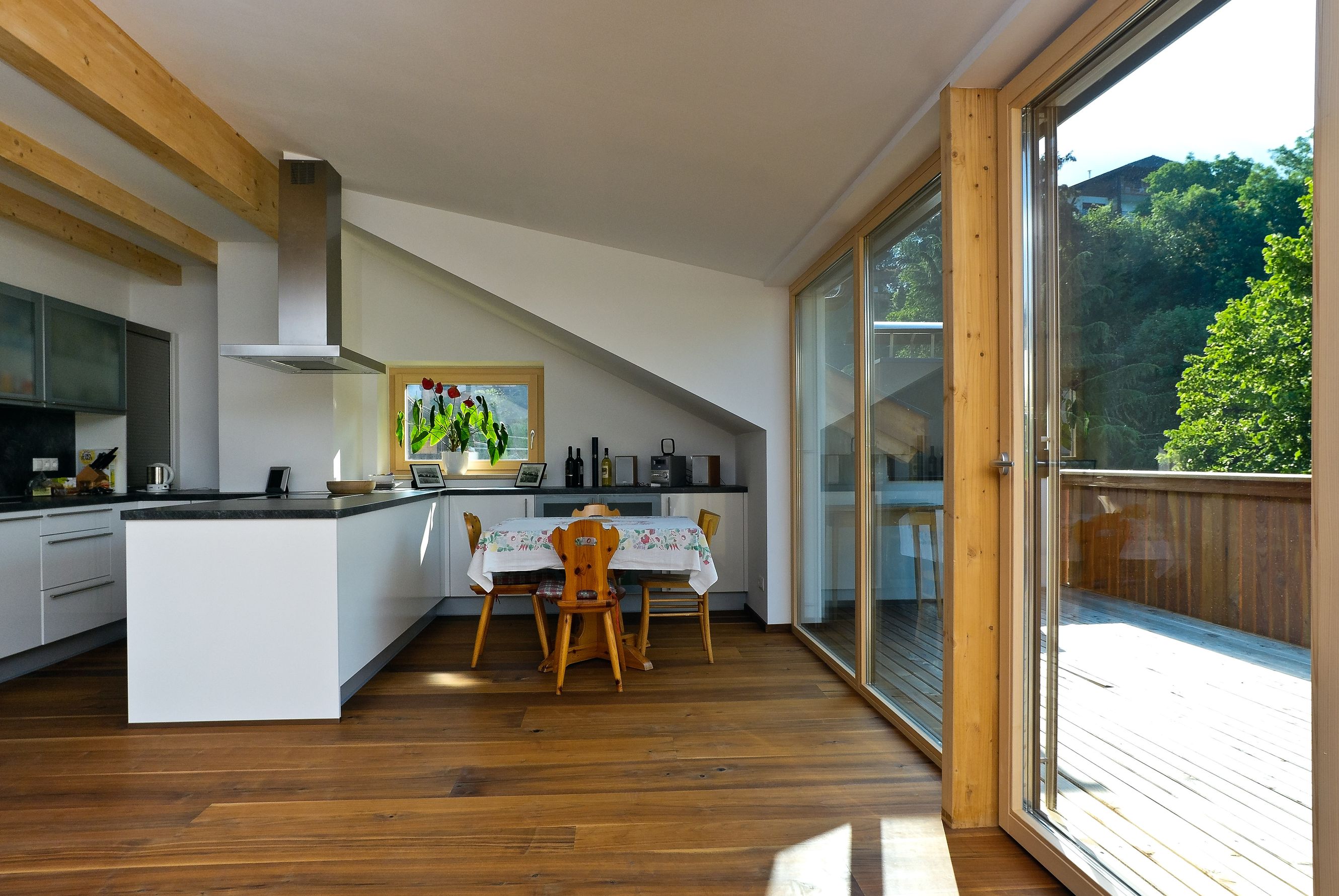 Ristrutturazione energetica e spaziale della mansarda di un edificio residenziale del 1956. La mansarda è stata aperta sul lato sud, dotata di ampie vetrate e terrazza per un’illuminazione naturale e guadagni solari ottimali. La ristrutturazione ha incluso l’isolamento delle pareti esterne e del tetto, nonché la sostituzione delle finestre.